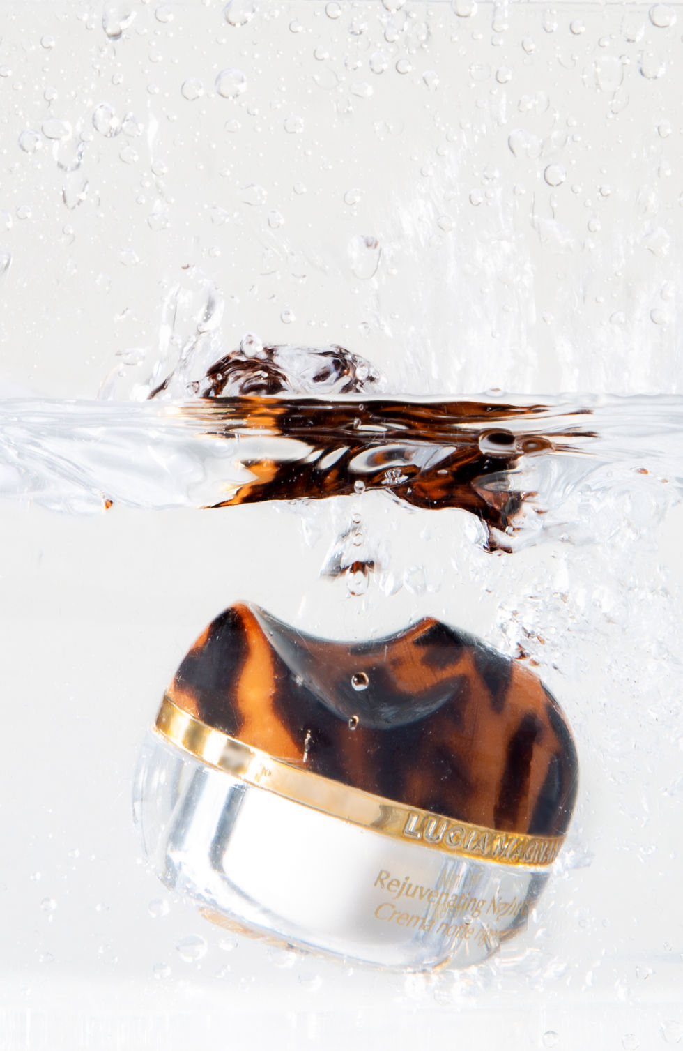 Indulge in the luxurious world of skincare with elegant glass jars, rippling water surfaces, and water splash effects.